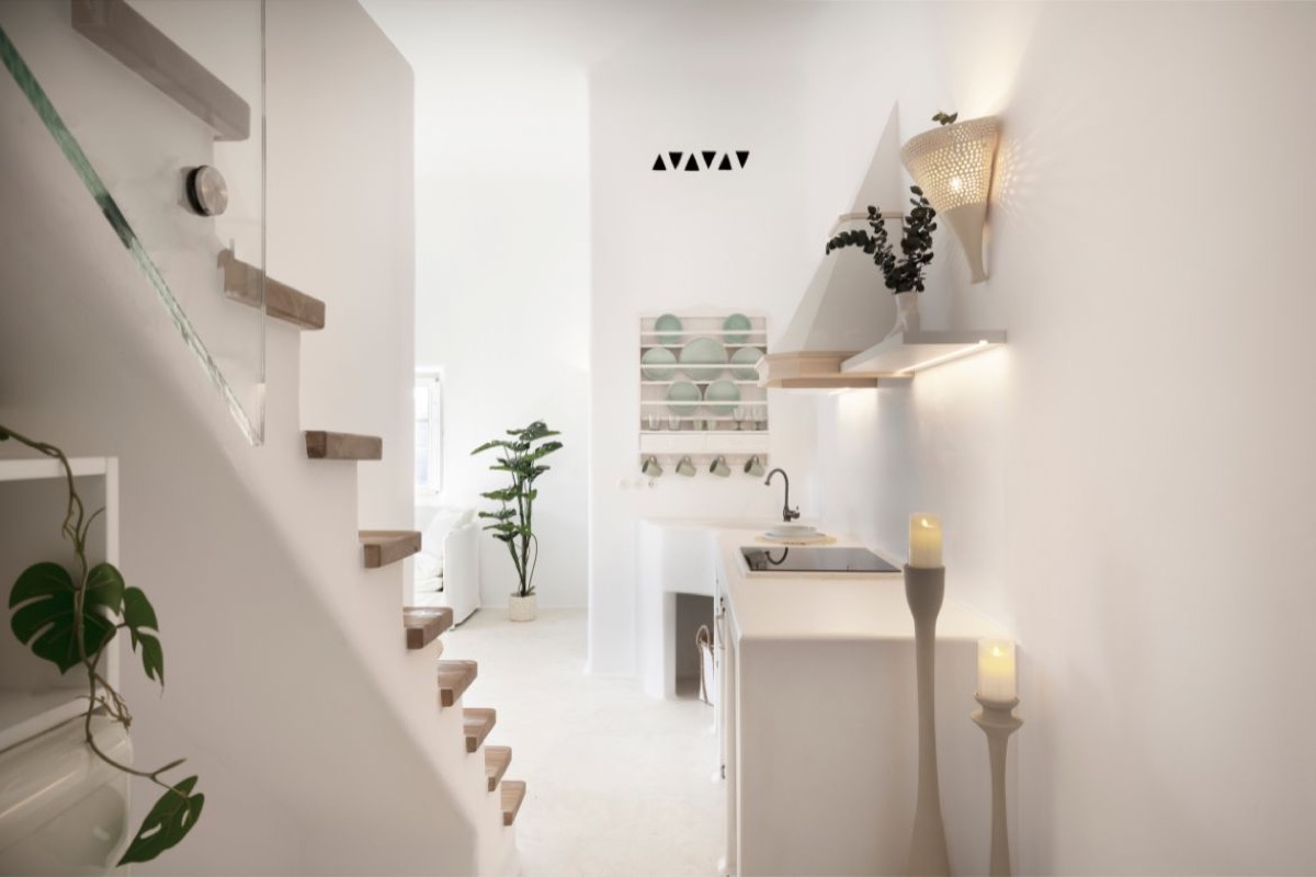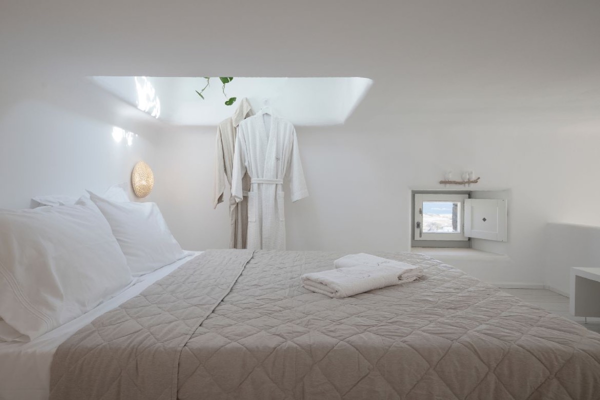 Soft light, calming tones, and minimal Cycladic elegance define the Deluxe Suite with Sea View, a welcoming retreat for up to 4 guests. The suite unfolds across two open-plan levels, connected by a staircase, and features two sleeping areas, each with a comfortable double bed, offering a serene layout ideal for couples, friends, or small families.