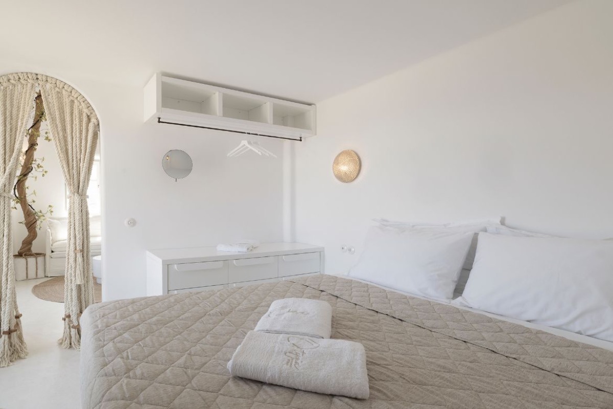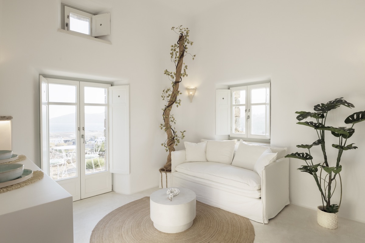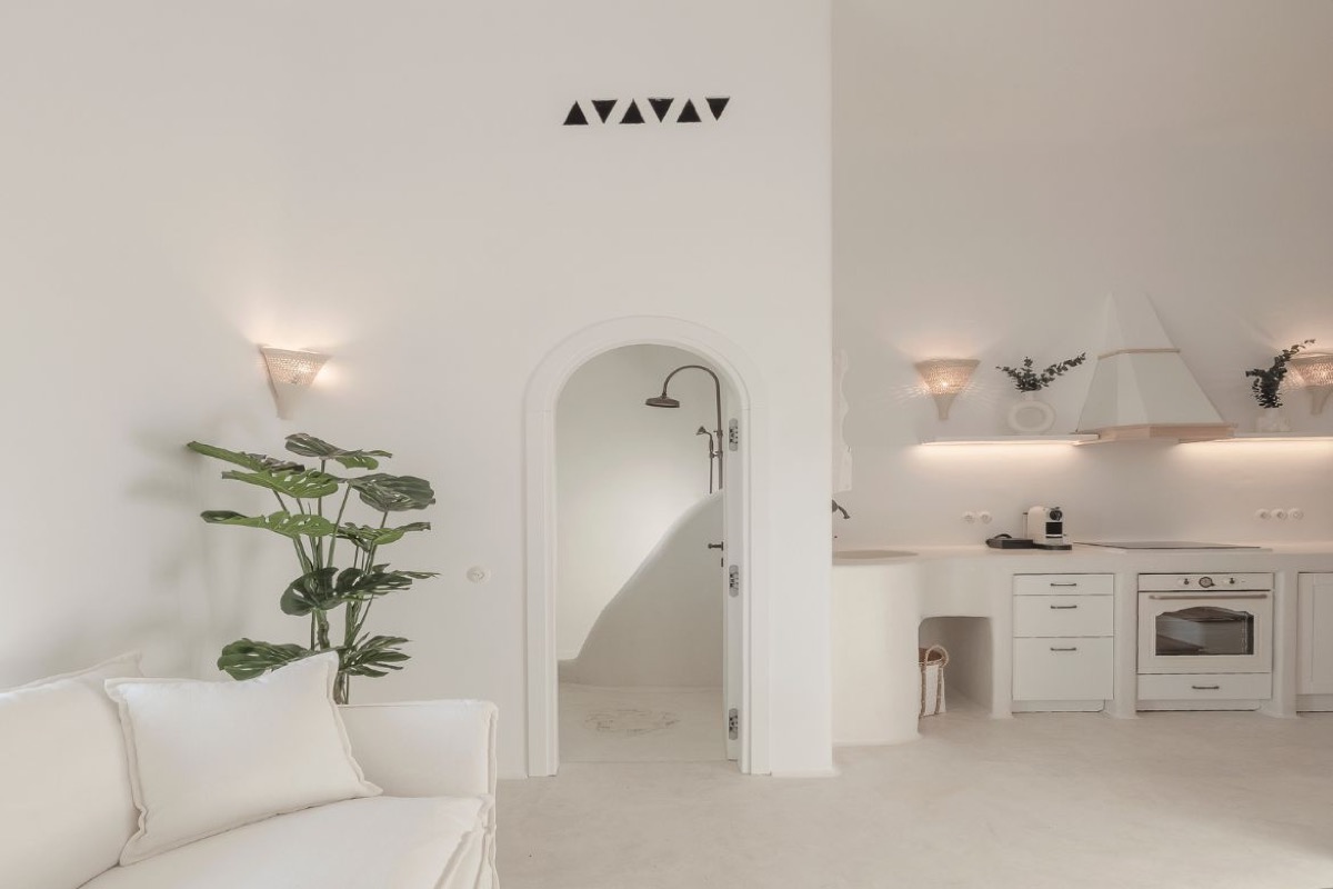 The living room offers a comfortable sitting area with a beautiful sea view, adding a subtle touch of Mykonian charm. An outdoor front space facing Ftelia Beach extends the living area, providing a cozy corner where guests can enjoy the sea breeze, relax throughout the day, or unwind after exploring Mykonos.
