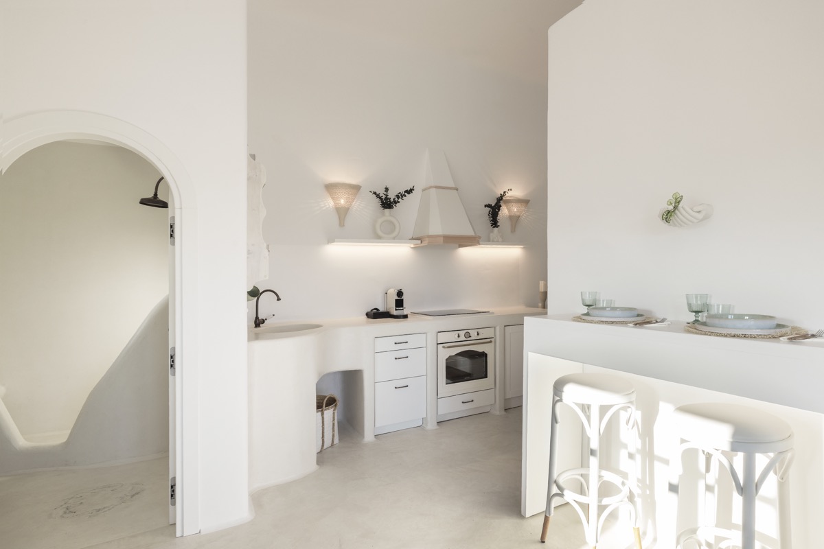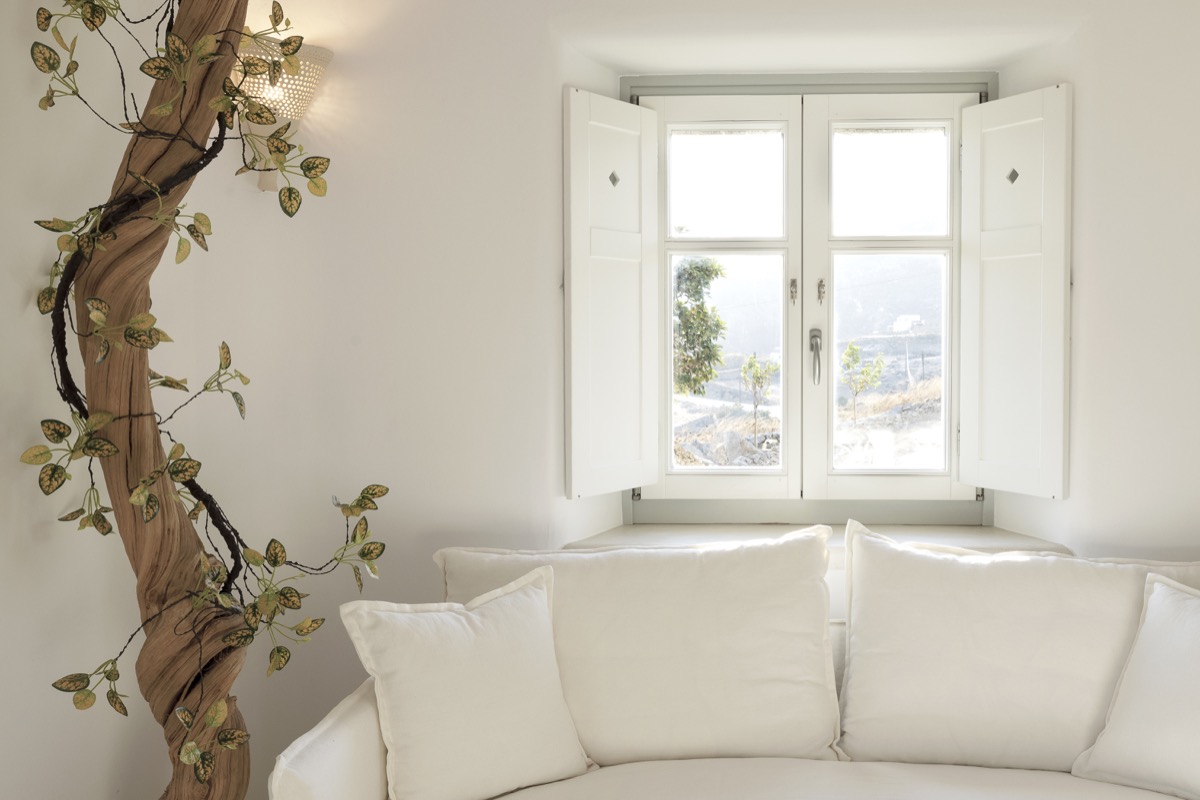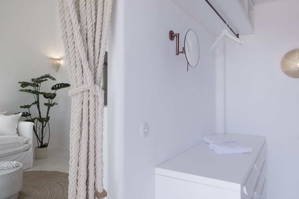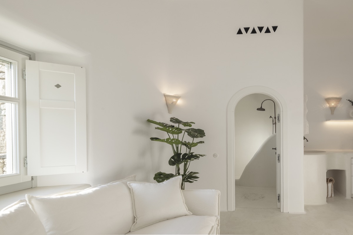 The living room offers a comfortable sitting area with a beautiful sea view, adding a subtle touch of Mykonian charm. An outdoor front space facing Ftelia Beach extends the living area, providing a cozy corner where guests can enjoy the sea breeze, relax throughout the day, or unwind after exploring Mykonos.