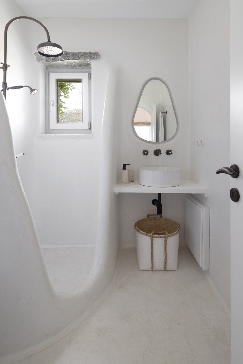 A bright, minimal bathroom with a walk-in shower enhances the suite’s soothing atmosphere and provides a refreshing cleansing experience.