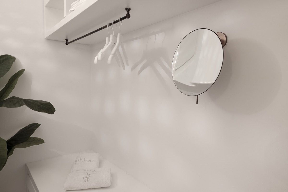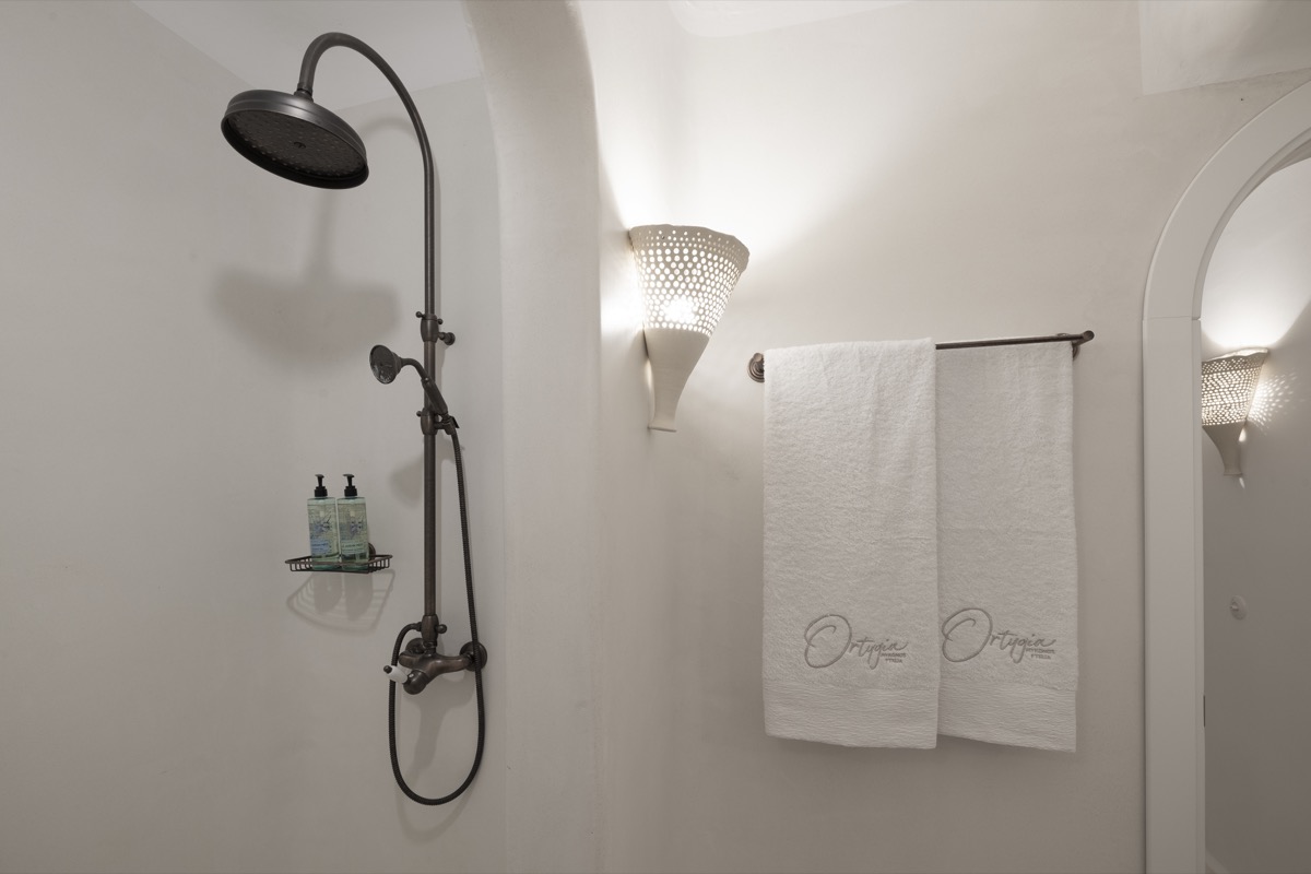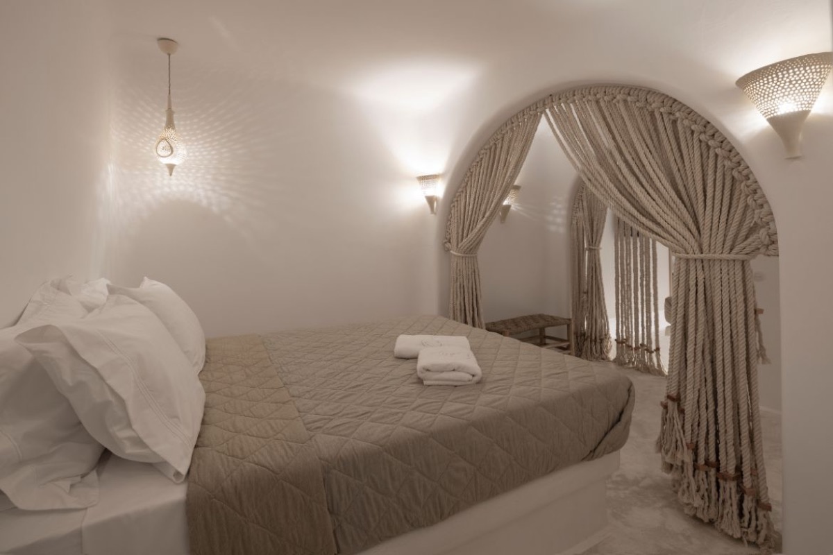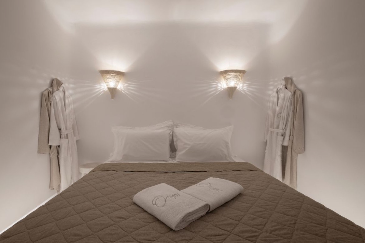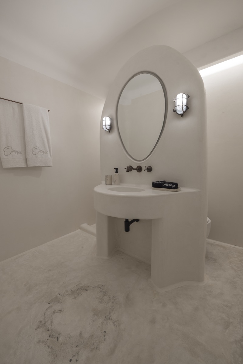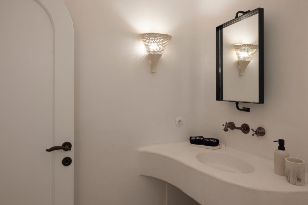 A highlight of the suite is its beautifully crafted bathroom. With sculpted surfaces, gentle lighting, and a spacious shower area, it offers a soothing, spa-like bath experience - ideal for unwinding after your day in Mykonos.