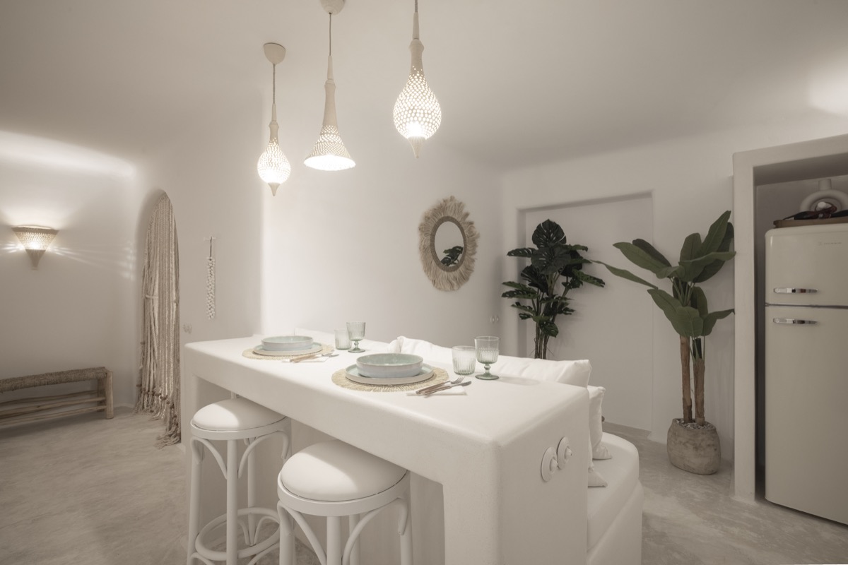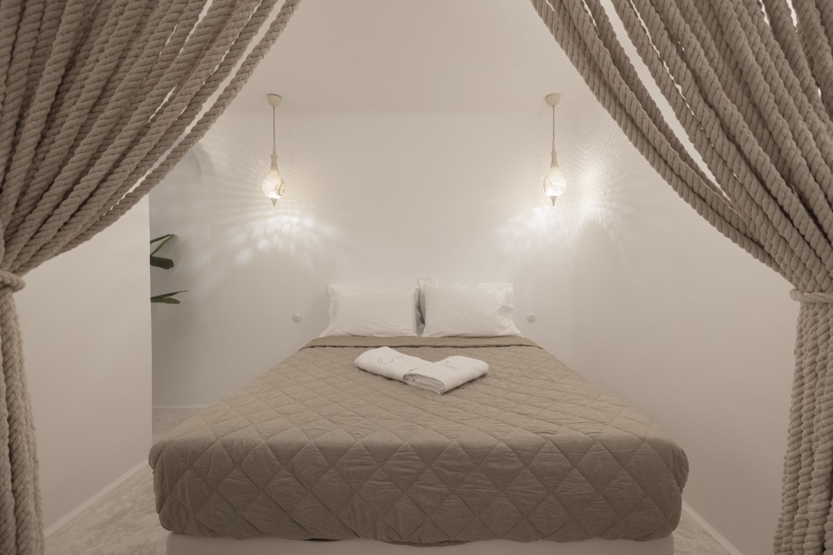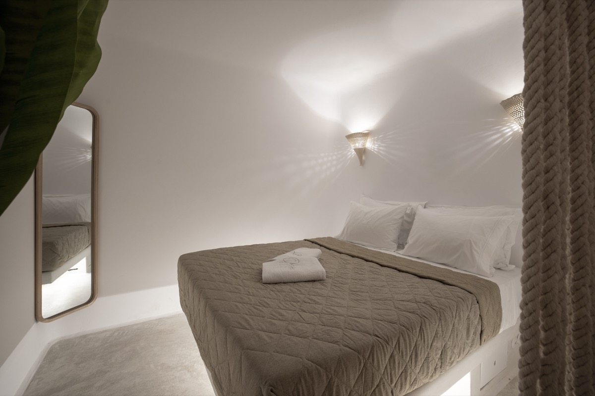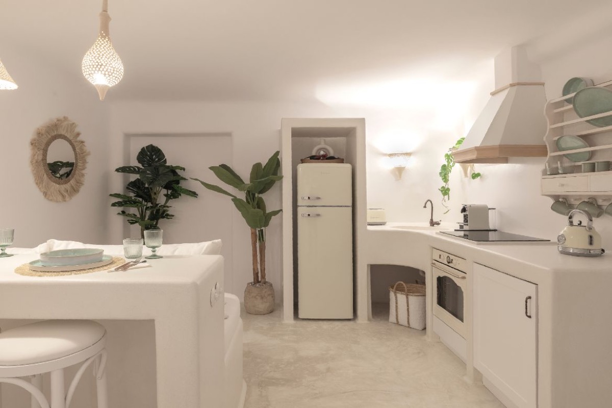 Located on the basement level, the Suite Cellar accommodates up to 4 guests in an open-plan space designed with soft Cycladic curves and minimal, earthy finishes. The suite features two open-plan bedrooms with double beds, a fully equipped kitchen, A/C, TV, Wi-Fi, bath amenities, towels, and all the essentials for a comfortable and relaxing stay.