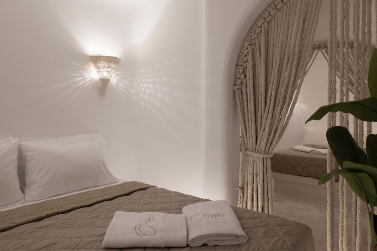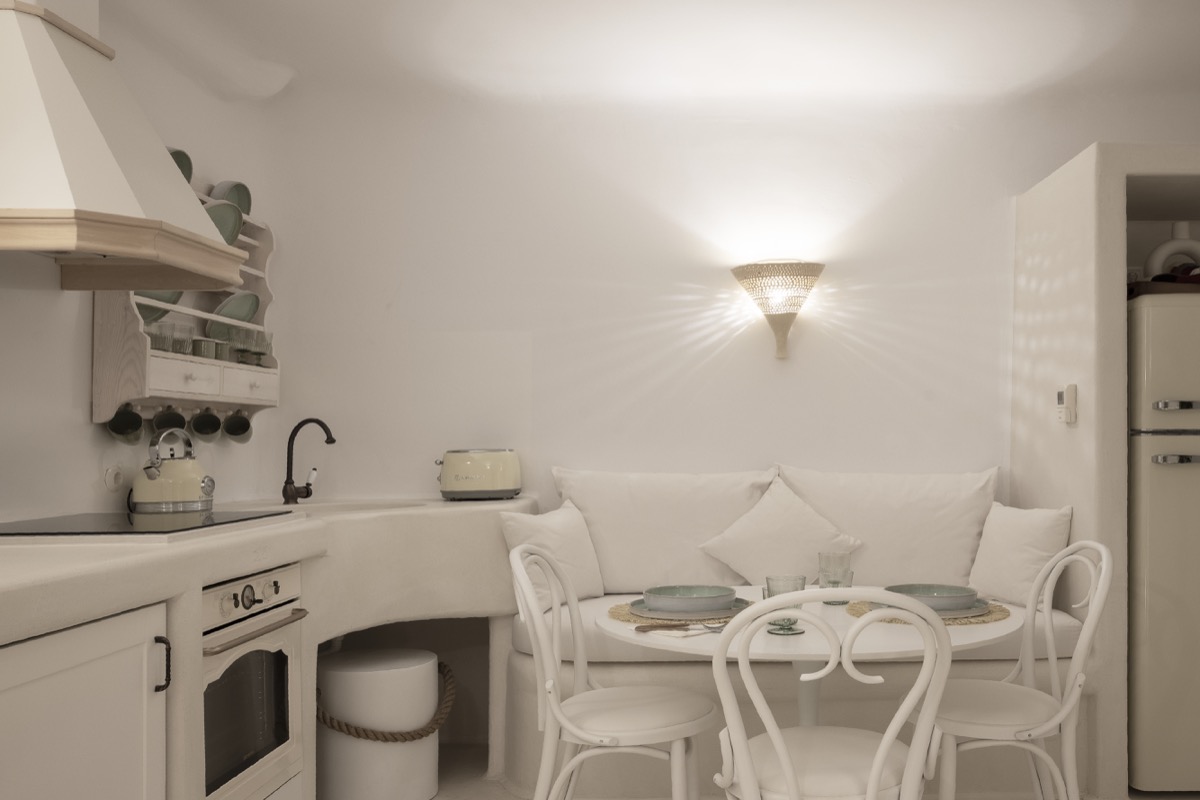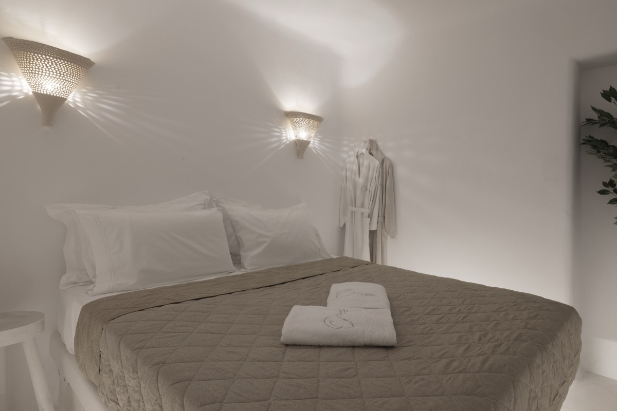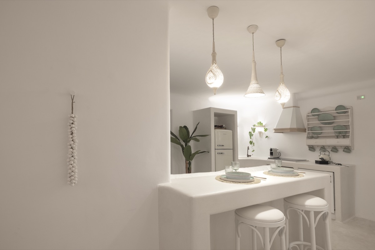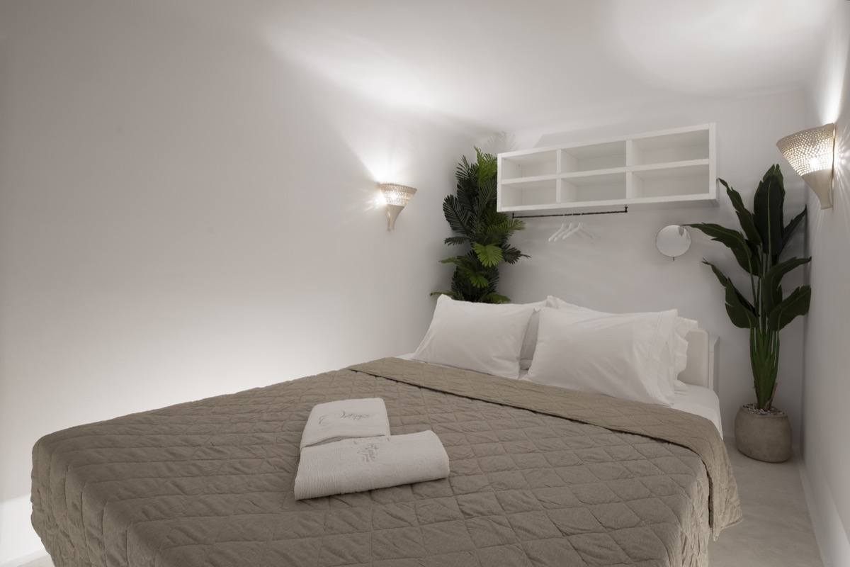 Located on the basement level, the Suite Cellar accommodates up to 4 guests in an open-plan space designed with soft Cycladic curves and minimal, earthy finishes. The suite features two open-plan bedrooms with double beds, a fully equipped kitchen, A/C, TV, Wi-Fi, bath amenities, towels, and all the essentials for a comfortable and relaxing stay.