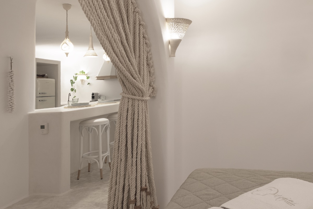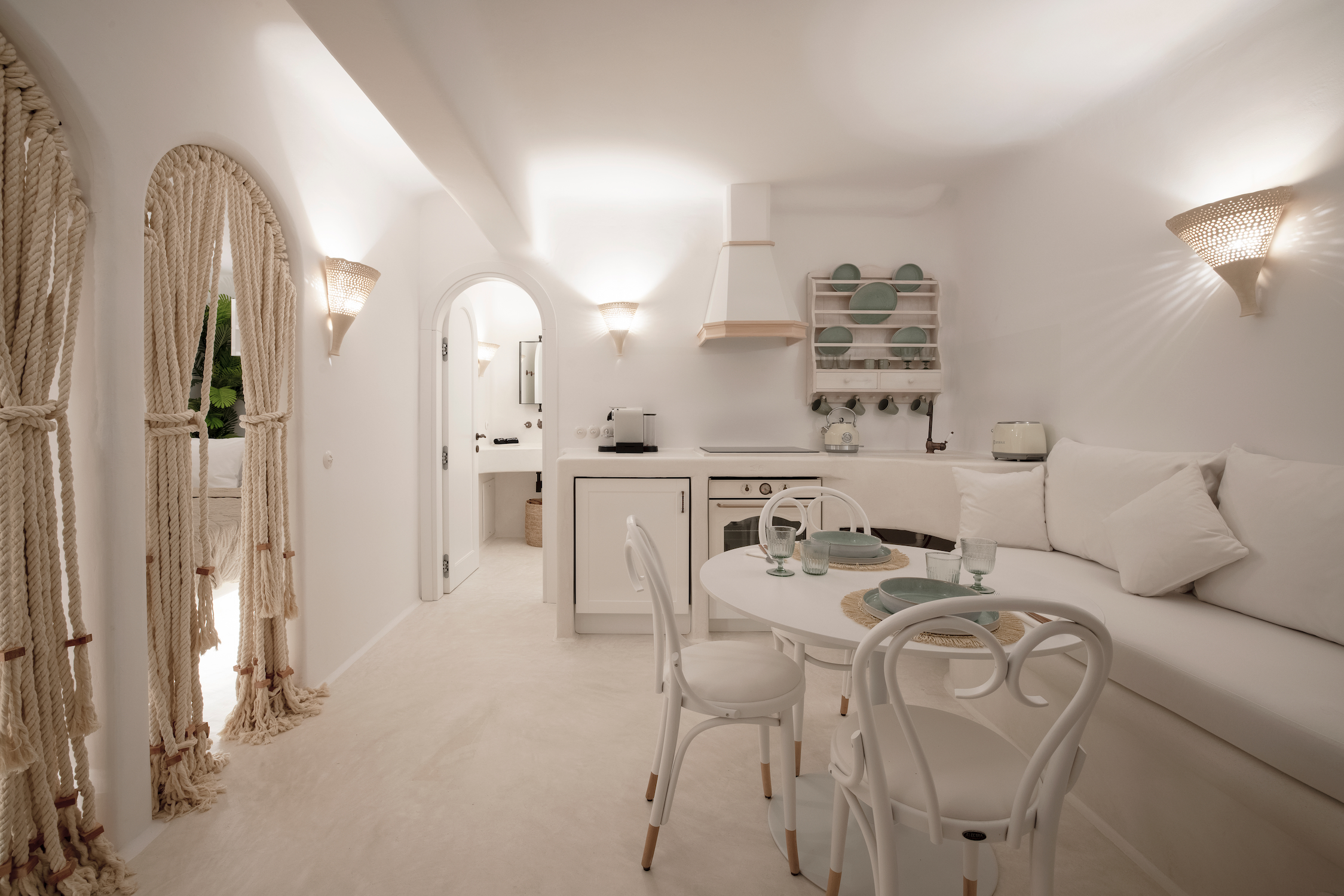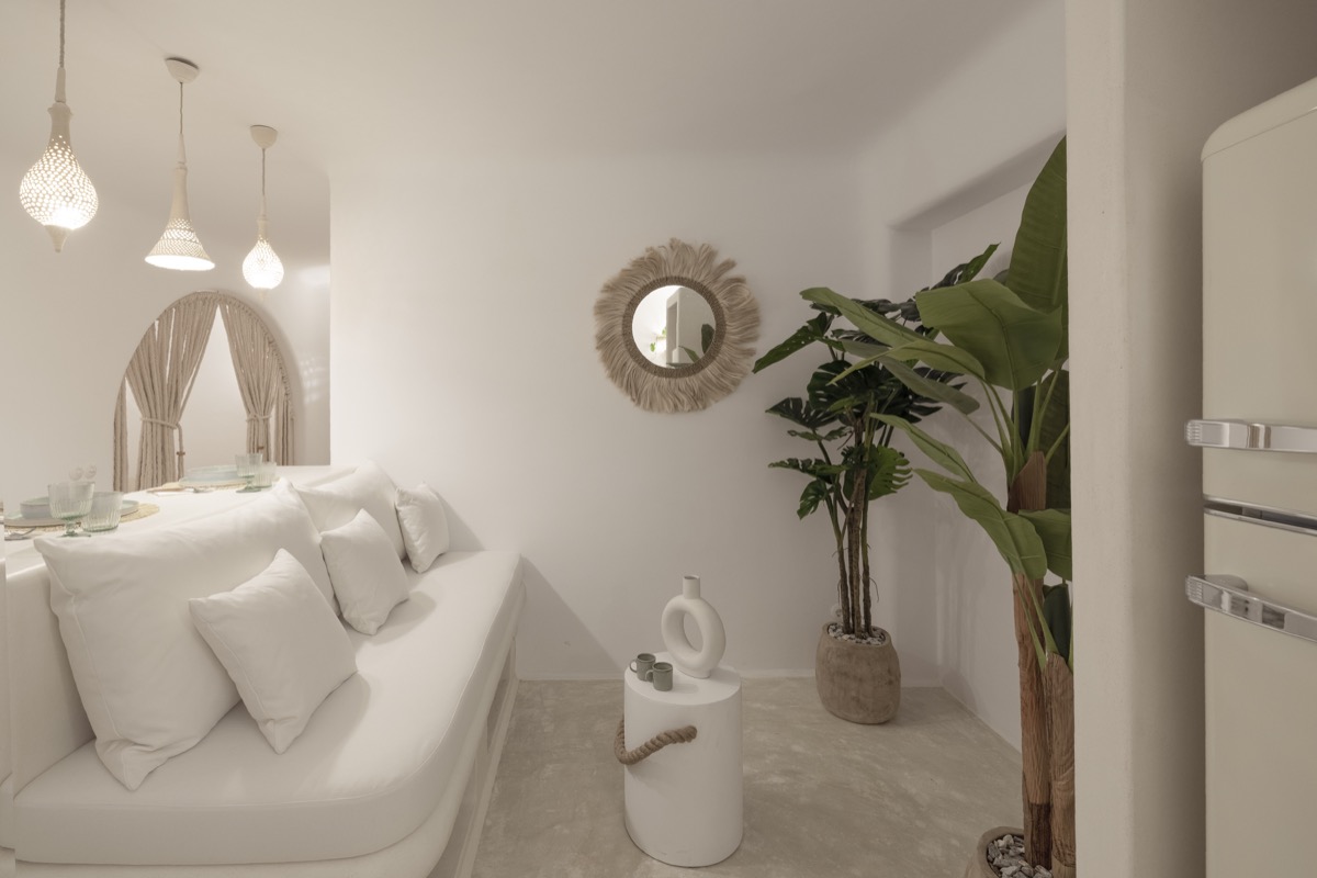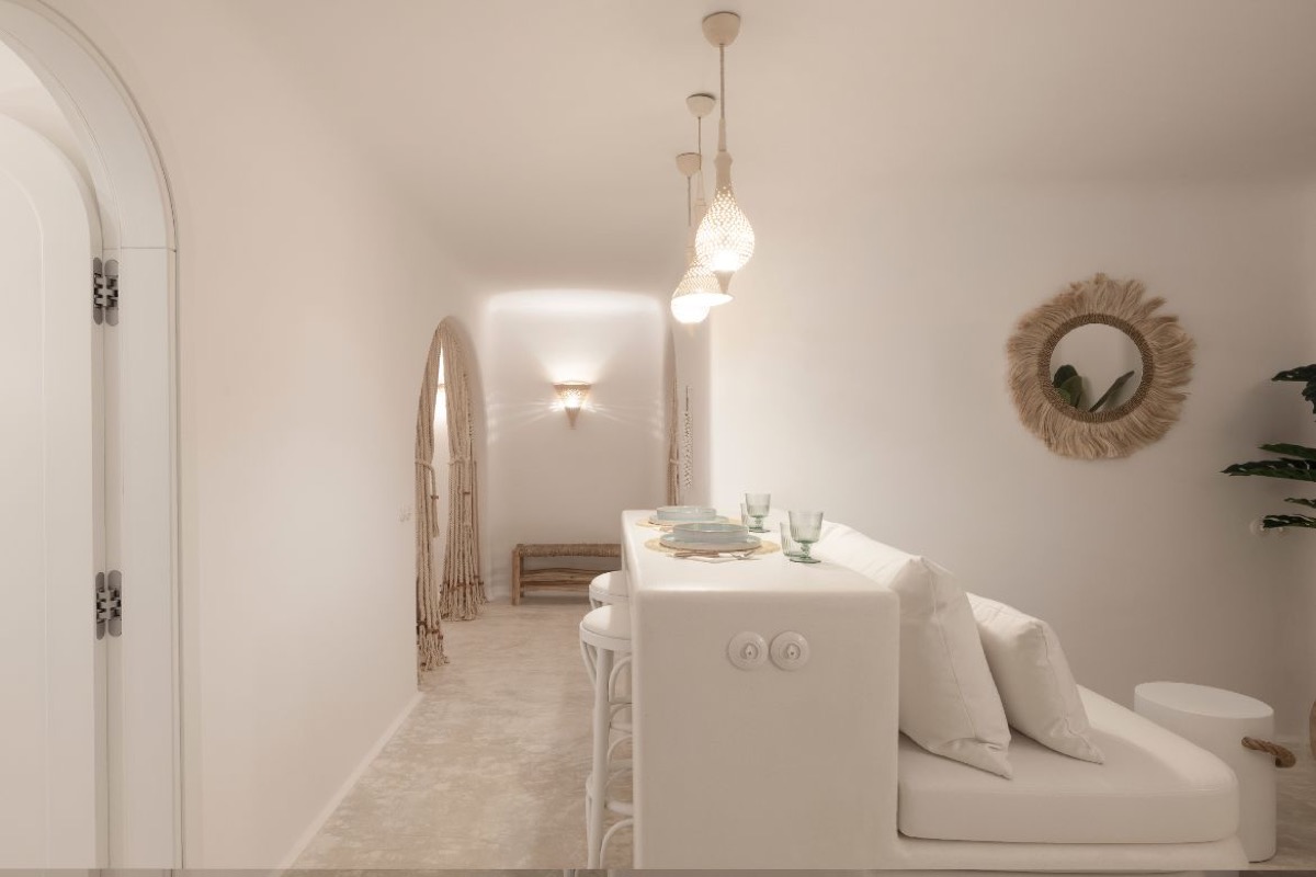 The aesthetic is rooted in clean Cycladic design, with warm ambient lighting, smooth lines, and natural textures that create a calming, boho-inspired atmosphere.