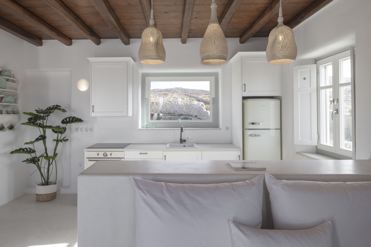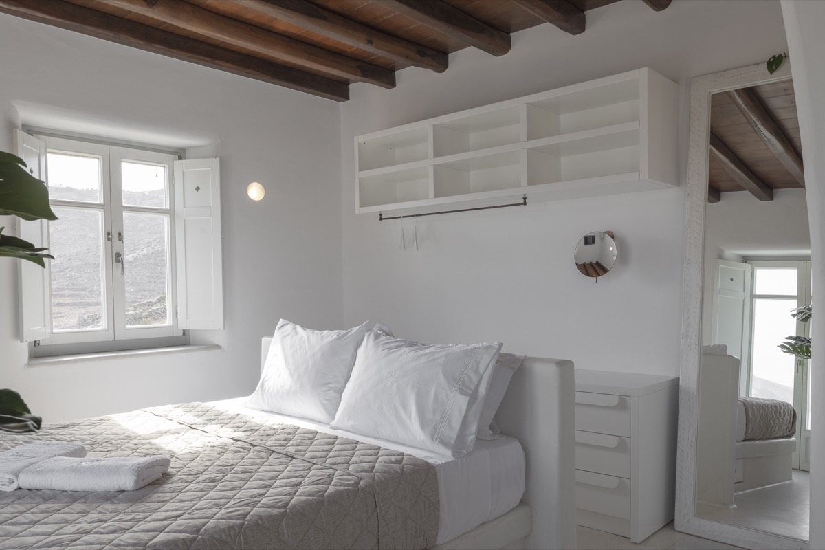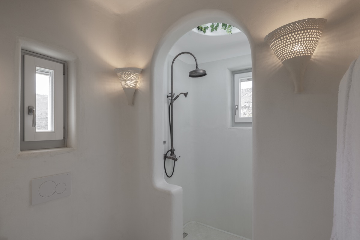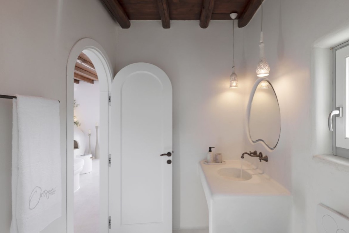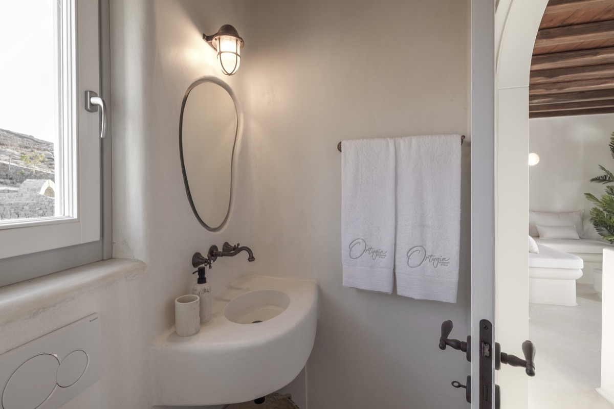 The bathroom is a minimalist Cycladic sanctuary, featuring a walk-in shower, sculpted sink, soft ambient lighting, and high-quality bath amenities. With natural light streaming through the window, it offers a refreshing and relaxing experience, allowing guests to unwind and rejuvenate in a calming, elegant setting.